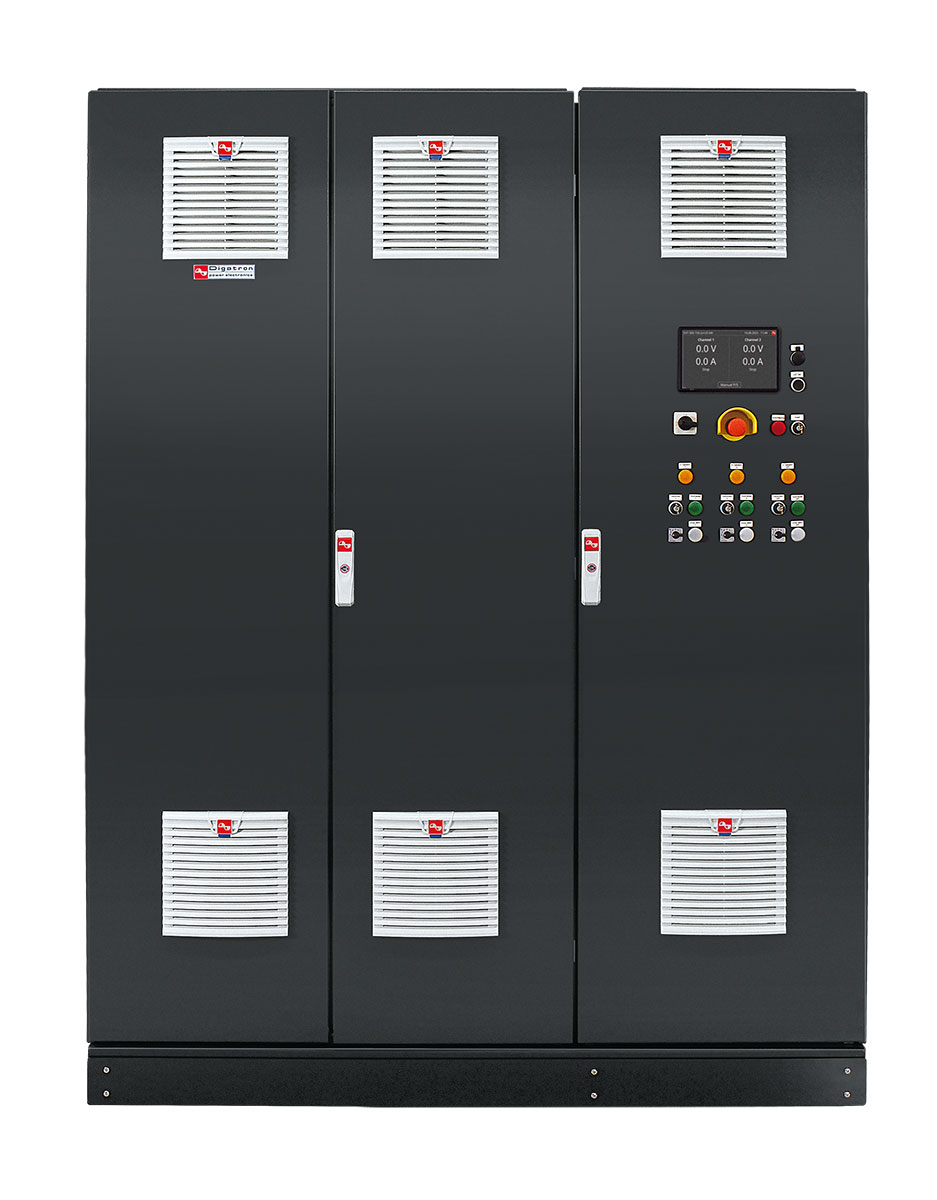 The Digatron EVT 1500 was developed to test high-voltage battery packs (e.g. for electric vehicles) with up to 1,500V, 1,000A and 320kW per power section. Its unique flexibility allows single, parallel or serial operation of the two output stages, each with 750 V and 500 A, without internal rewiring via a switching matrix with single and sum outputs. The device is equipped with state-of-the-art SiC MOSFET technology and is ideal for load changes in the millisecond range and the simulation of highly dynamic driving profiles.